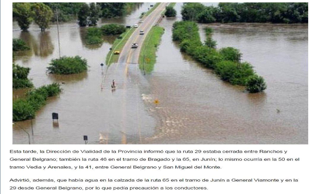 La Dirección de Vialidad de la Provincia informó que están cerradas las rutas 29, entre Ranchos y General Belgrano; la 46 en el tramo de Bragado y la 65, en Junín; lo mismo ocurría en la 50 en el tramo Vedia y Arenales, y la 41, entre General Belgrano y San Miguel del Monte.